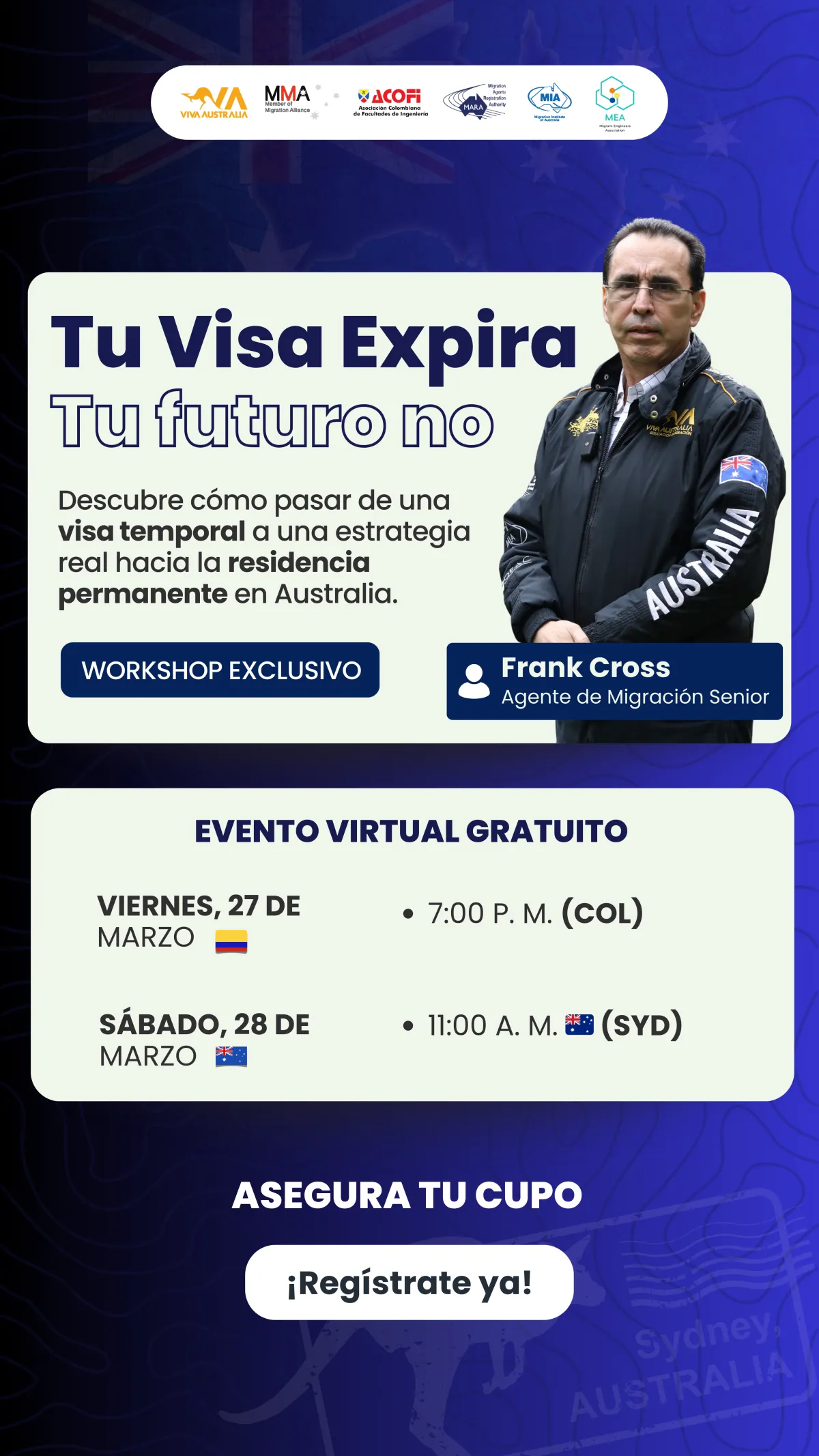 El evento será presentado por Frank Cross, Agente Senior de Migración (MARA 0101111), con más de 20 años de experiencia asesorando a profesionales calificados en procesos de residencia y migración laboral.